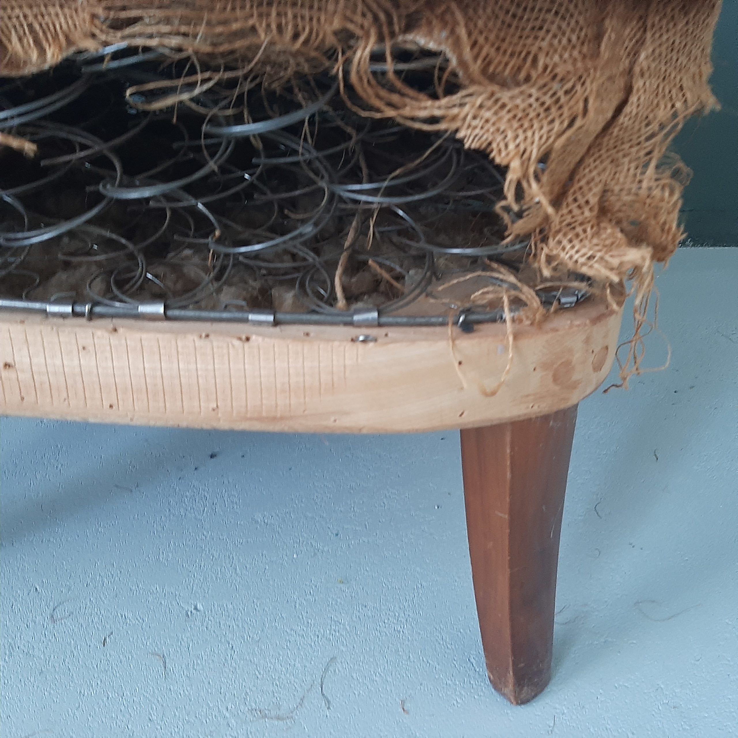 Fauteuil is geheel gerestaureerd – waarbij de binnenvering uiteraard intact is gebleven – en het overige binnenwerk is vervangen door koudschuim. Voor de stoffering is een hoogwaardige maïsgele meubelstof gekozen in combinatie met de kleur muisgrijs, wat een mooi contrast vormt en de fauteuil een eigentijdse uitstraling geeft.